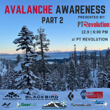Join SAC at PT Revolution, along with Tahoe Sports LTD, Blackbird Mountain Guides, Tahoe Lab, and TBA, for this FREE event as we talk all things backcountry including pro tips to minimize injury... more