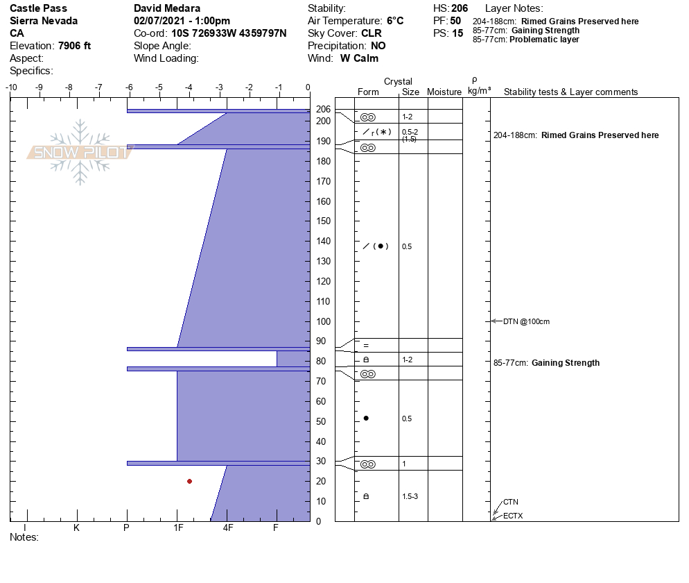 Location Name: Castle Pass Region: Donner Summit Area Observation Date & Time: Sunday, February 7, 2021 - 01:30 |