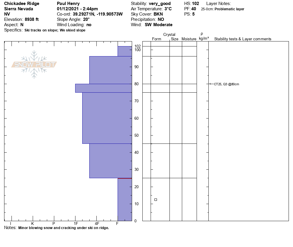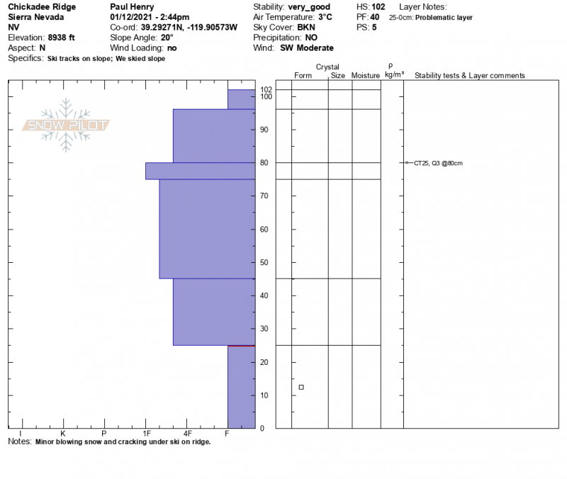 Location Name: Chickadee Ridge Region: Mount Rose Area Observation Date & Time: Tuesday, January 12, 2021 - 14:30 |