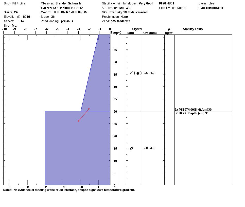 Wet snow at surface on full shade northerly aspects capable of producing roller balls up to 1 foot in diameter. This will eventually form a new crust in the snowpack. Temperature gradient across the layer interface of frozen rain affected basal layer and recent new snow layer above has the potential to produce faceting and is something to watch.