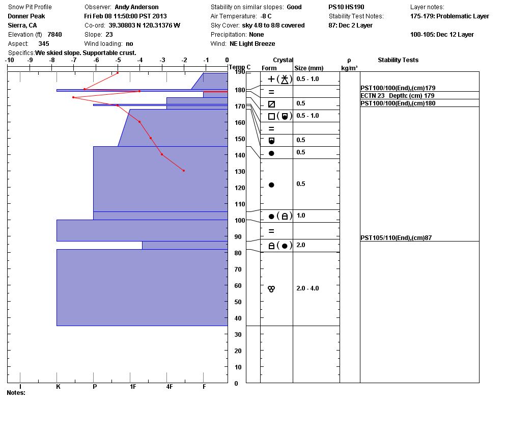 2-4 inches of new snow rested on top of supportable crusts in the Donner Peak area on W-NW-N-NE-E-SE aspects. On the exposed windward aspects, the new snow had been scoured away and firm crusts remained exposed. On some of the more heavily wind loaded NE-N aspects, small wind slabs up to 16 inches deep existed. These wind slabs did not extend very far down slope but did crack and fracture in response to a skier's weight. the moving snow on these test slopes would entrain the wind slabs and the loose snow on top of the crusts below the wind slabs. In non wind affected areas, the new snow did not display many slab characteristics. The crusts below the new snow would support the weight of a skier or snowboarder in this area. Below these crusts a thin layer of weak sugary snow still exists. Fractures did not travel along this layer during tests today.