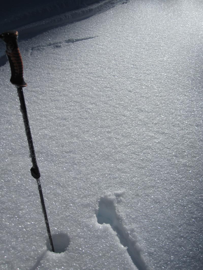 Sheltered N-NE aspects still holding several inches of soft cold unconsolidated snow on the surface at all elevations in this area. In some areas patches of surface hoar had formed and were present at the end of the day today. In the lower elevation trees some areas had become icy due to snow falling off of the trees. On the E-SE-S aspects wet sticky snow existed in sun exposed areas by 1pm. In the shady areas on these aspects thin crusts existed in some places and soft snow in others. Ski cuts on test slopes, handpits, snowpit tests, and general observations did not yield any signs of instability in this area today. Probing showed that the Dec. facet layers are buried between 175cm and 195cm below the surface in this area.