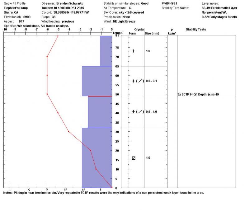 HS in this area increased 2 to 3 times with the Nov 8-10 snowfall event. HS in most wind protected locations is this area is now 50 to 60 cm (photo). Numerous hand pits while ascending from east to west on Elephant's Hump did not reveal any evidence of buried surface hoar. Surface hoar that was widespread in this area on Nov 6 was likely destroyed by wind and warming air temperatures prior to snowfall on Nov 8.