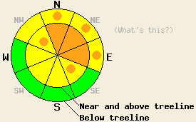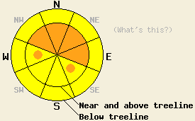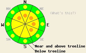 December 23, 2008 at 8:03 Near and above treeline the avalanche danger is MODERATE with pockets of CONSIDERABLE on NW-N-NE-E-SE slopes steeper than 35 degrees. Below treeline the avalanche danger is LOW with pockets of MODERATE on open slopes steeper than 35 degrees. |