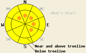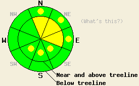 February 11, 2009 at 7:59 Near and above treeline the avalanche danger is MODERATE on N-NE-E aspects on slopes steeper than 35 degrees. Pockets of MODERATE danger may exist on cross-loaded NW and SE aspects as well. Below treeline the avalanche danger is LOW with pockets of MODERATE in open areas, 37 degrees and steeper on NW-N-NE-E-SE aspects. |