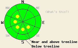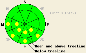 December 25, 2008 at 8:11 Near and above treeline on slopes steeper than 35 degrees, the avalanche danger is CONSIDERABLE on N-NE-E aspects with pockets of CONSIDERABLE on NW and SE aspects. Below treeline on open slopes steeper than 35 degrees, the avalanche danger is MODERATE with pockets of CONSIDERABLE on the NW-N-NE-E-SE aspects. Human-triggered avalanches will be probable today. Use extra caution when traveling in the backcountry. |